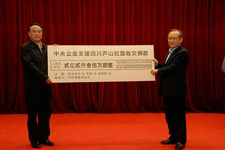 4月25日下午,在中央企业支援四川芦山抗震救灾(第二批)捐款仪式上,国资委党委副书记、副主任黄淑和表示,中央企业和四川人民一起,同心同德、众志成城,夺取抗震救灾和灾后重建的新胜利。四川省副省长刘捷对中央企业积极参与抗震救灾并向灾区捐款表示感谢,称赞中央企业是四川抗震救灾的重要力量和生力军。中国电建党委书记晏志勇代表中央企业发言,介绍了企业抗震救灾的具体情况。